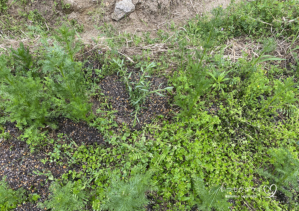 ジャガイモ畝の周りは最初はぐるっと花壇だったのですが、今は一番奥をソラマメさんに使ってますし、横を何か他の野菜で使うのはありと思ってます。ただ、今回は気になることがひとつだけありまして…。