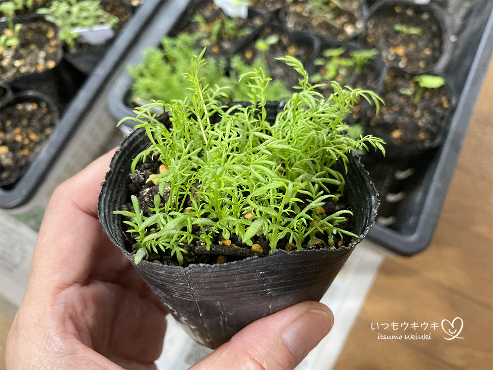 まだ小さな苗なのに、指にはほんのりと香りが残る。でもそれは、確かにカモミールの香り。
